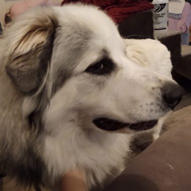 We do not have a lot of his background. He was rescued by a WONDERFUL couple on Ft Campbell (we love y’all Cullen and Rebecca!!!) from being turned over to a shelter and they found us after contacting multiple full rescues – we were full too but as we have a special place in our hearts for big fluffies so we made room. His background is not all sweetness and light for sure – he has definitely been mistreated at some point as certain movements will elicit a strong aversion/fear reaction (cowering, etc) and he VERY sadly has DEFINITELY been teased by young children (maybe toddlers/young grade school age). He actually loves kids but if they pull back or move quickly toward him he reacts FAST and with a snap. While we are confident this behavior can be overcome we ARE going to restrict his placement to a home without young children. This is also NOT a dog for the faint of heart, or for anyone not experienced in training and leadership with large canines. He needs to be WALKED on leash “properly” (meaning not just meandering on the leash; he needs to be by your side no pulling, etc) to establish his place in the world (ie accept his human’s authority). He needs time to process certain situations and needs his human to establish firm boundaries and understand how to handle him – he does always not respond well to commands if he does not feel safe or in control – for example grabbing his collar to physically have him come forward when he is unsure or unwilling is not an option right now. He responds to firm command but not physical leading/correction/urging – you need a leash/positive encouragement. It sometimes takes him a minute to process what exactly his human wants. He has already improved greatly as he is learning to trust me; at first getting him into his indoor pen area (he is too big for an actual crate so we set up an indoor larger x-pen area) took treats/going in first. Now he goes happily in and out at my command but it will take the same bonding/authority process for each human. The walks will have to continue – it’s a common way that canines accept their leaders.