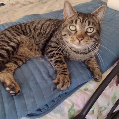 Not quite 5 years old, he is neutered, fully vetted, uses the litter box and is just a super affectionate incredible all around cat!!! Very well adjusted, happy boy – sadly was abandoned when his family moved (contact was made they don’t want him). A young soldier rescued him from dumpster life and contacted us.