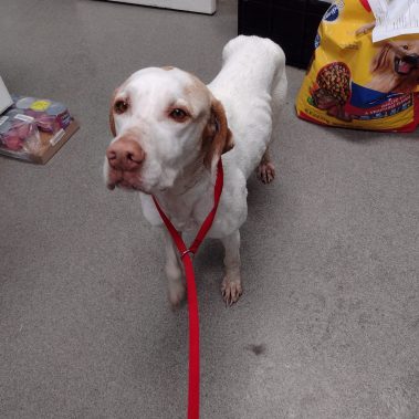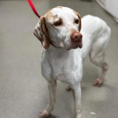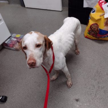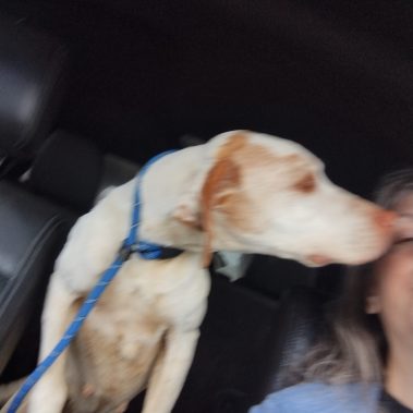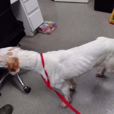 This beautiful emaciated English pointer has been running around a wooded area just south of our farm. I finally caught her and she’s been taken to the vet she has a long road medically ahead of her.