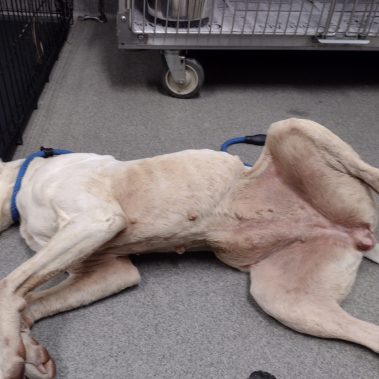 She’s at least 20 lb under weight, she has cellulitis, she is heartworm positive, and we pulled well over a hundred ticks off her and we are waiting for the tick panel to come back, praying it’s negative. In addition she has some weakness in her hips and right rear leg AND 2 tumors. The vet estimates her age at about 7 and she is sweet as she can be… She just laid down and let me pull ticks off her for 3 hours!!!
