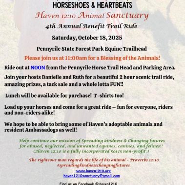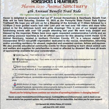 4th Annual Benefit Trail Ride – Horseshoes & Heartbeats – at the Pennyrile State Forest Horse Trailhead on Bainbridge Rd (KY 139) Saturday October 18
