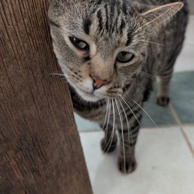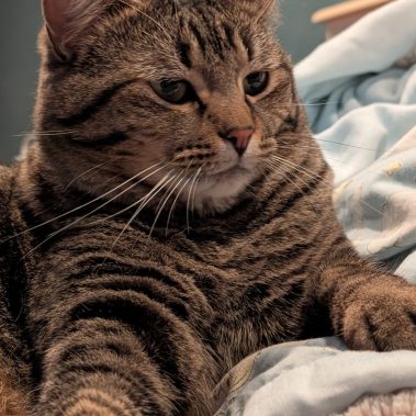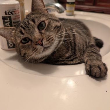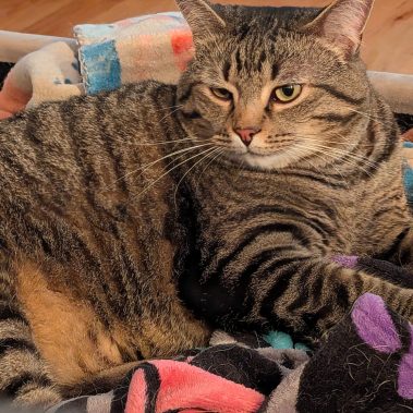 One of our longtime vets always says round kitties are the best kitties… Well may we present Gideon!! Aka the Giddy kitty. Gideon just showed up at the farm one day, a very young, thin cat. We fed him and got him neutered and vetted and thought he might be a barn cat but he quickly flunked barn cat school! How you ask? He wanted to be friends with EVERY creature he came in contact with – including wild ones like raccoons and coyotes – and invariably showed up with wounds and scratches and he would get in with the horses to the point where it wasn’t safe just trying to seek companionship! Several vet visits later we decided he needed to become an indoor cat. He still wants to be friends with every critter he meets and is firmly convinced that everyone loves him. He’s hilarious. He’s perfectly round…. with the cutest little meow. Gideon is up to date on all vaccines and preventatives.