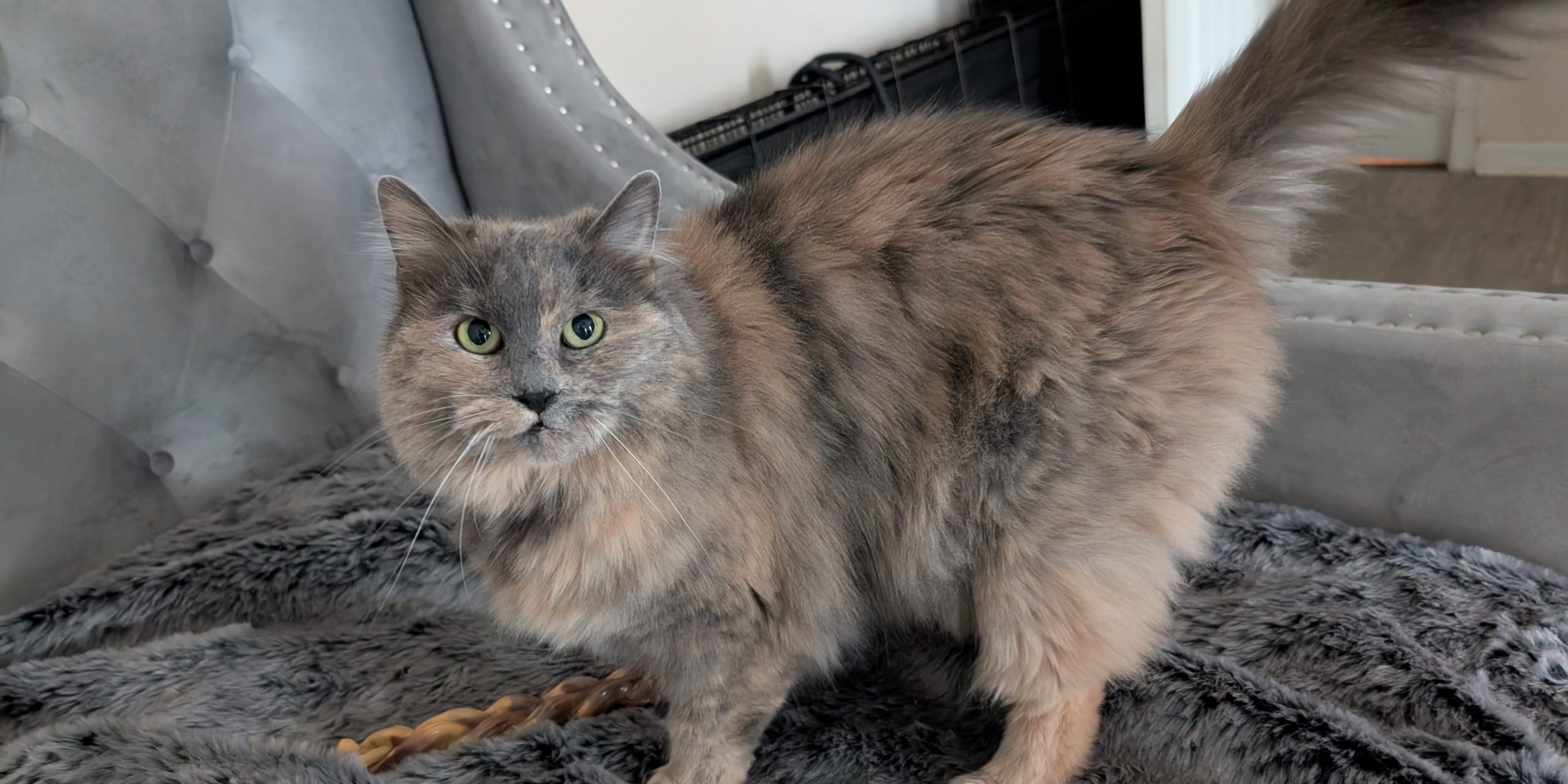 Gigi has no use for other felines, preferring the company of dogs and humans. She does love her canine friends! She will coexist with other cats but is definitely the queen bee. At 14 years old and having overcome a shattered pelvis and jaw injury from being hit by a car, we figure that’s just fine! She requires grooming as we see as she ages she is less vigilant about keeping that gorgeous coat of hers mat-free. She is truly a stunning beauty – and she’s well aware of her charms! She is spayed and up to date on vaccines and preventatives