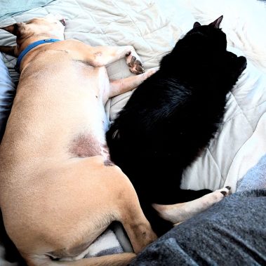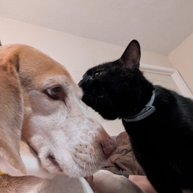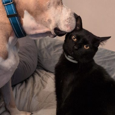 Monte came to Haven quite a few years ago… This shiny black cat with the glowing eyes loves loves loves his canine friends!! He has a special bond with Mr. Magoo are blind and sensory impaired Boxer/Shar Pei mix. Monte can be very shy at first and will likely take a while to come out of his shell… He’s about 10 years old now and a fun, quirky, handsome cat who somehow always senses when you are trying to get close to him to put him in a carrier to go to the vet!! Monte is neutered, up to date on vaccines and all preventatives.