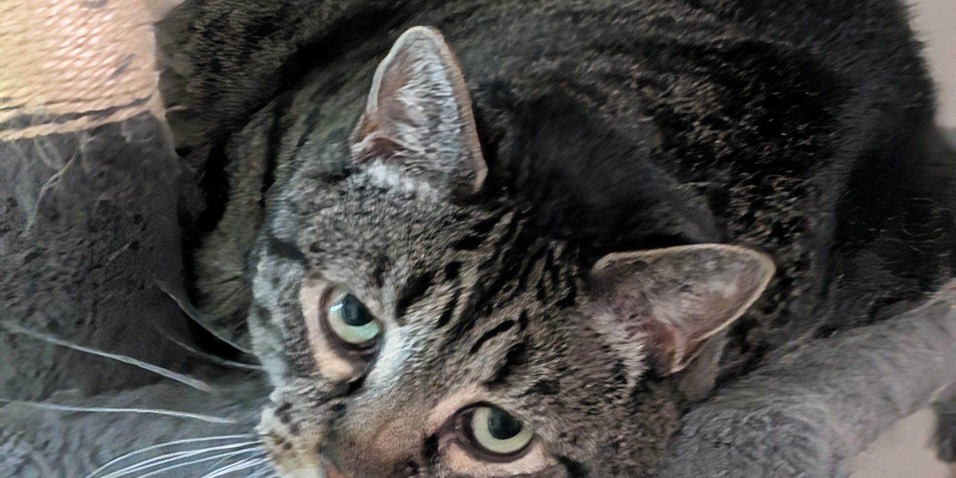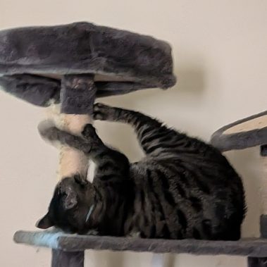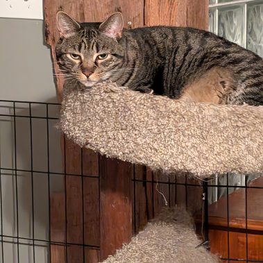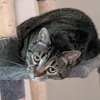 The Rum Tum Tugger!!! At 8 years old, this handsome neutered male domestic shorthair is a healthy, incredibly affectionate, BIG boy, weighing in at 18 lbs!! If there is a lap available he would prefer to be in it! He lives peacefully for the most part with the pack, although he prefers humans and dogs over some of his fellow felines. He has formed a really good bond with one of our other male cats, Ross. He is strong and healthy and loves to purr, climb cat trees and receive lots of cuddles. He is up to date on all vaccines and preventives and has no known health issues.
